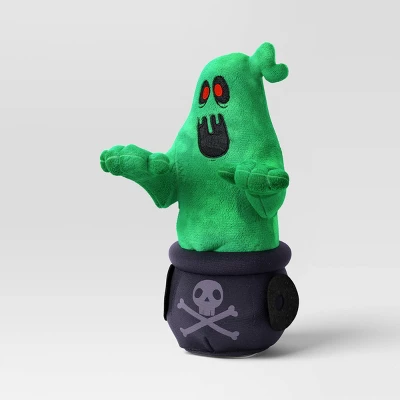 This 11.02-Inch Animated Plush Cauldron Ghost Halloween Decorative Prop from Hyde and EEK! Boutique™ brings a ghoulish aesthetic to your festive decor. Made from plastic, this Halloween decorative plush prop showcases a green ghost with black features and orange eyeballs, springing from a textured gray cauldron adorned with a skull and crossbones motif in light gray. Plus, the battery-powered prop plays a sound script for enhanced eerie vibes.