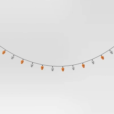 Make your Halloween decor brighter and creepier with these 20-Count LED Skull Halloween Novelty String Lights from Hyde and EEK! Boutique™. These decorative string lights showcase a black wire strung with white and orange skulls detailed with black features and fitted with 20 white LED bulbs to light up your space with an eerie glow. Suitable for indoor and outdoor use, these battery-powered string lights are great for decorating your entryway, backyard, porch or patio.