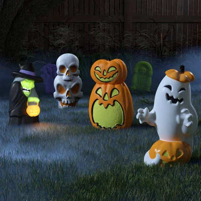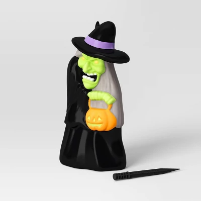 Instantly add creepy style to your outdoor Halloween decor with this Light and Sound Witch Outdoor Halloween Decorative Prop from Hyde and EEK! Boutique™. This witch decorative prop comes to life with noise and light when activated by sound. Featuring a laughing witch holding a lighted jack-o’-lantern, this prop plays sounds when activated.