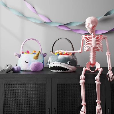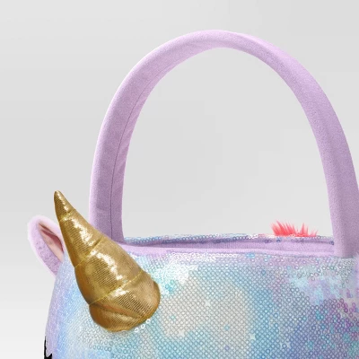 Collect treats in mythical style with this Halloween Unicorn Round Polyester Trick or Treat Decorative Bling Basket from Hyde and EEK! Boutique™. This pretty and practical basket features an all-over shiny finish and charming unicorn along with a handle for easy carrying. Use this magical accessory for any costume occasion or even as home decor.
